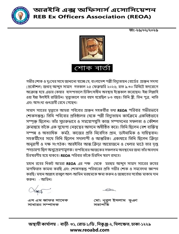 গত ১৪/০২/২০২৬ইং তারিখে বনানী ষ্টার কাবাব হোটেলে REOA সদস্যদের গেট টুগেদার ও ব্রেকফাস্ট ০২/০২/২০২৬ইং তারিখে REOA এর নির্বাহী কমিটির সদস্যবৃন্দ বাপবিবোর চেয়ারম্যান মহোদয়ের সাথে এক সৌজন্য সাক্ষাতে মিলিত হন ০২/০২/২০২৬ইং তারিখে REOA এর নির্বাহী কমিটির ২য় সভা অনুষ্ঠিত হয় ১৭/১২/২০২৫ইং তারিখে REOA এর নির্বাহী কমিটির ১ম সভার খন্ড চিত্র প্রথম বার্ষিক সাধারণ সভা-২০২৫ এর কিছু খন্ড চিত্র বিভিন্ন সময়ে অনুষ্ঠিত সভা ও গেট-টুগেদার এর কিছু খন্ড চিত্র এজিএম এর প্রস্তুতিমূলক সভা । তারিখ: ২৯/১১/২০২৫ । এজিএম এর প্রস্তুতিমূলক সভা । তারিখ: ২৯/১১/২০২৫ । মাহফুজ স্যারের বাসার ছাদে গেট-টুগেদার । প্রাক্তন চেয়ারম্যান স্যার সহ সিনিয়র কর্মকর্তাবৃন্দ অন্তর্বর্তীকালীন নির্বাহী কমিটির সভা অন্তর্বর্তীকালীন নির্বাহী কমিটির সভা অন্তর্বর্তীকালীন নির্বাহী কমিটির সভা